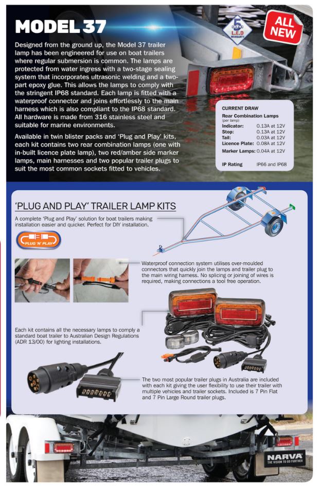 KIT CONTAINS: 1x 12V L.E.D slimline rear stop/tail, direction indicator lamp with in-built retro reflector, 0.5m lead and waterproof connector (93730); 1x 12V L.E.D slimline rear stop/tail, direction indicator with licence plate lamp and in-built retro reflector, 0.5m lead and waterproof connector (93734); 2x 12V L.E.D slimline side marker lamp (red/amber) with 0.5m lead and waterproof connector (91332); 1x 7 pin flat trailer plug with 1m lead and waterproof connector (82142); 1x 7 pin large round trailer plug with 1m lead and waterproof connector (82183); 1x ‘Plug and Play’ boat trailer harness with waterproof connectors;