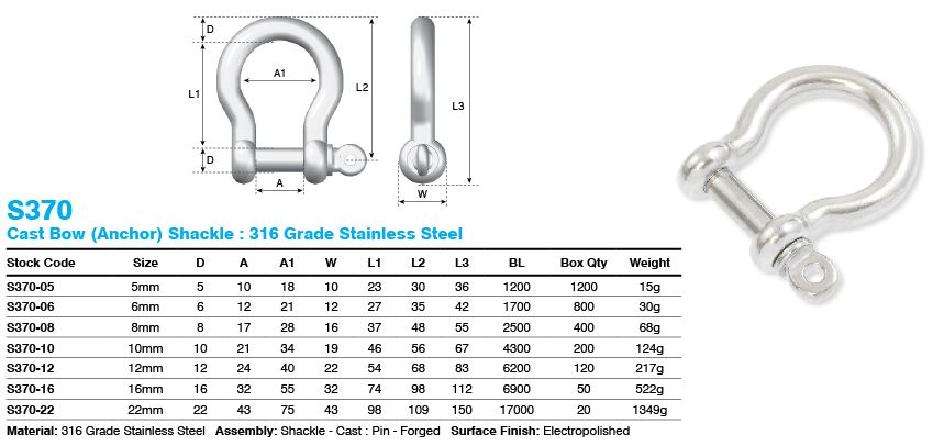 A cast bow shackle is a general-purpose connector used to link ropes, chains, or hardware in various marine and industrial applications. Formed through a casting process, it offers a strong, stable structure with a wide, rounded bow that accommodates multiple attachment angles. While not as strong as forged versions, cast bow shackles provide reliable performance for lighter to moderate loads and everyday rigging tasks.