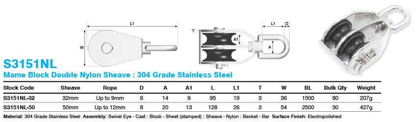 32MM BLOCK DOUBLE NYLON SHEAVE SS 304