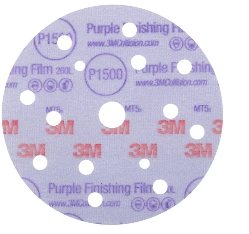 Our 3M Hookit Purple Finishing Film Abrasive Disc 260L features an updated coating that levels surface defects on clear coat and greatly reduces pigtails. Aluminium oxide abrasive cuts fast, lasts a long time, resists loading with or without hole pattern designs and leaves a consistent, easy-to-polish finish. Our 3M Hookit attachment system makes disc change-outs fast and easy.