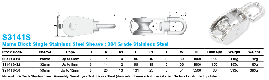 50MM BLOCK WITH SS SHEAVE 304 SINGLE