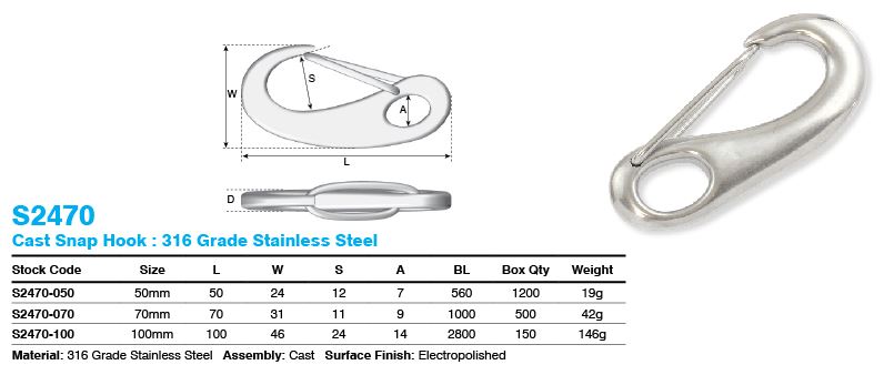 A snap hook is a quick-release metal connector designed with a spring-loaded gate that opens easily for fast attachment and closes automatically for secure holding. Durable and versatile, snap hooks are commonly used in marine, industrial, and outdoor applications to connect ropes, chains, or straps. Their simple, one-handed operation and reliable locking action make them ideal for situations requiring both convenience and dependable strength.