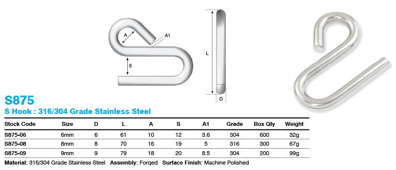 A Stainless Steel S Hook is a durable and corrosion-resistant connector designed for secure fastening in marine and other challenging environments. Made from high-quality stainless steel, it resists rust, saltwater, and extreme weather conditions, making it perfect for marine applications like securing lines, ropes, or equipment on boats and ships. Its simple “S” shape ensures quick attachment and removal, providing a reliable solution for both industrial and recreational use in the marine, construction, and outdoor industries.