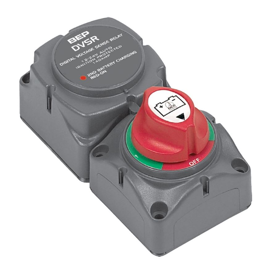 Pre-wired module combining Mini Battery Selector Switch and a dual sensing Voltage Sensitive Relay. With the selector switch in position 1, it becomes the sensing battery for the VSR. When the engine is first started the relay is open and remains open until the selected battery reaches a preset 13.4 volt. The relay closes at the rated voltage providing charge to both batteries. When the selected battery voltage drops below 12.8 volt, the DVSR disengages, separating the batteries and ensuring that battery 1 is not discharged by house loads. When the selector switch is in position 2, this becomes the sensing battery and the reciprocal occurs. When the selector switch is in the both position the DVSR is inactive and the charge and load is distributed evenly between the batteries. With this system the loads are run off the same battery as the engine starting battery.
