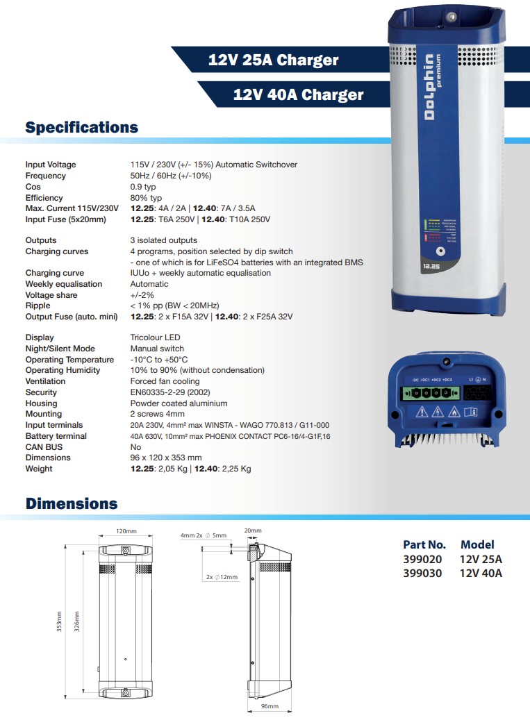 The third generation Dolphin range includes the Premium model, a selection of high quality, value-for-money battery chargers up to 60 Amps in 12V and 20 Amps in 24V.