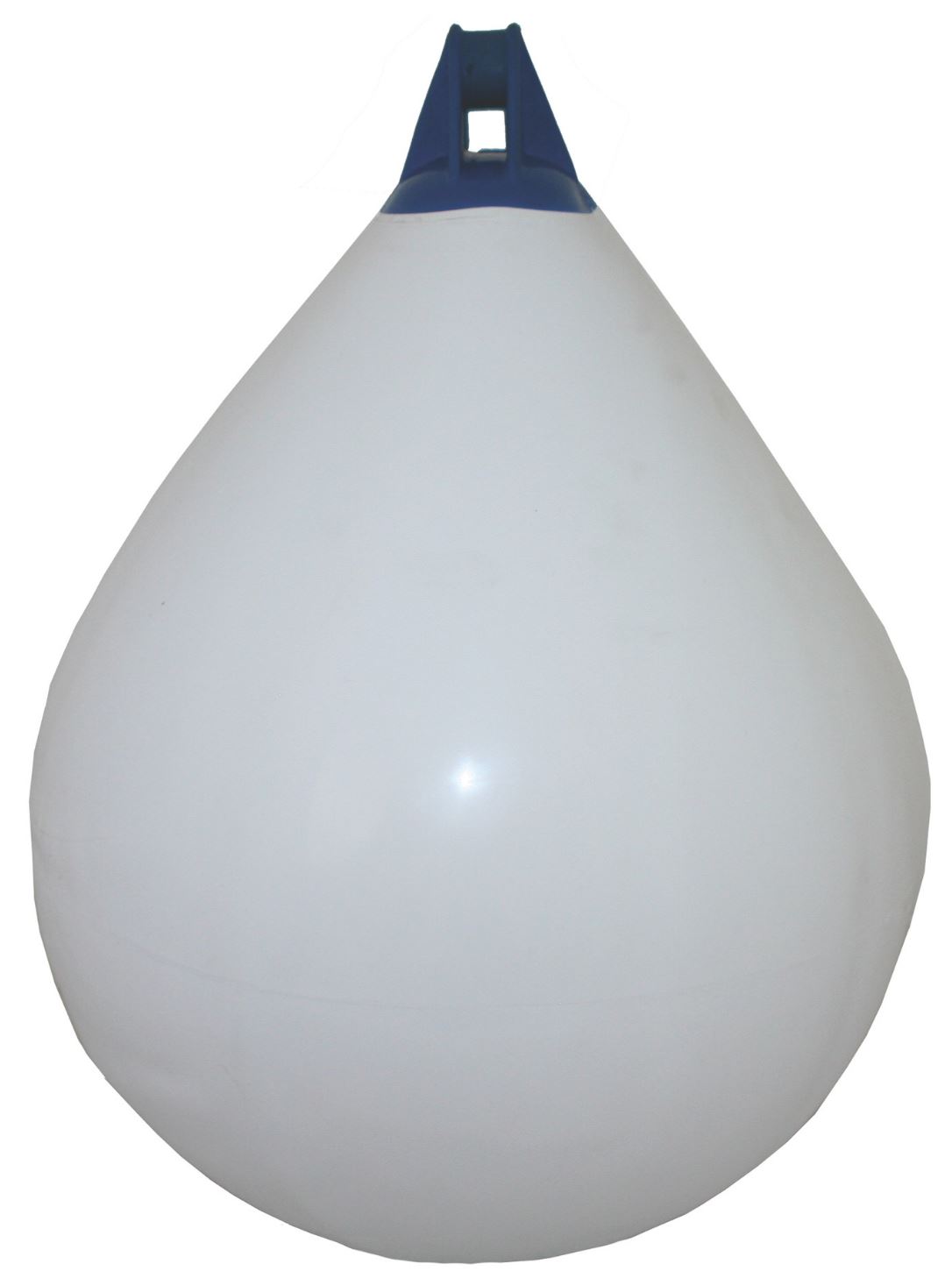 450mm Dia x 620mm length Top quality UV resistant white PVC teardrop style infl atable fenders / buoys with heavy duty blue reinforced eye. They have applications for use as fenders on pleasure or commercial vessels or as float buoys. Inflate fenders with an air compressor or use a special majoni