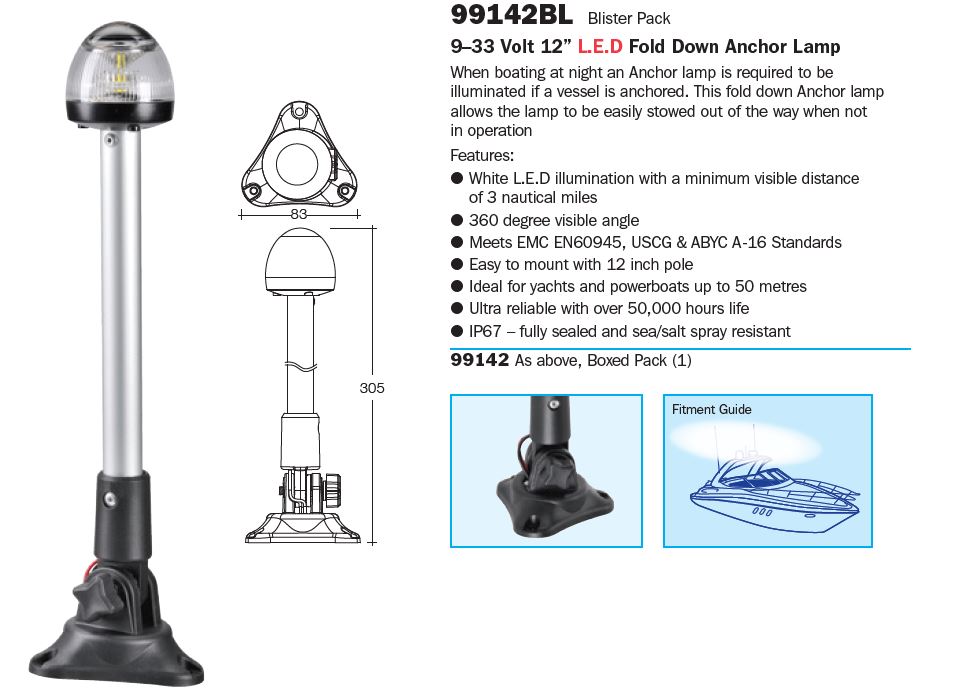 When boating at night an Anchor lamp is required to be illuminated if a vessel is anchored. This fold down Anchor lamp allows the lamp to be easily stowed out of the way when not in operation.