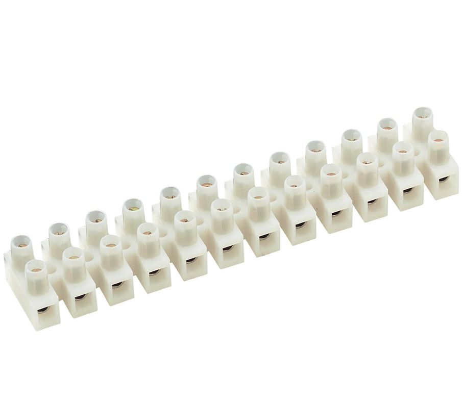 Strip of 12 terminal blocks, manufactured of polyamide (nylon), with a maximum operating temperature of 105 C (Degrees Celsius).