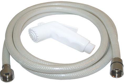 Italian made white hand shower sets which are ideal as a transom shower unit. The moulded plastic shower head has a lever action on / off switch and a moulded eye to hang it up. The set comes complete with either a 3 Mtr or 5 Mtr reinforced PVC hose that has 1/2″ female chrome connection fi tting on the shower head end & 3/8″ female chrome connection on the water supply end. Suits all Nuova Rade & Plastimo deck showers.