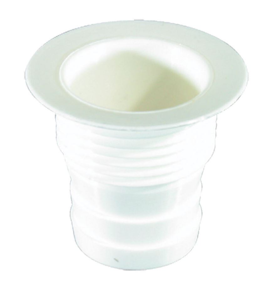 Moulded white nylon. Unique design provides 90° elbow or straight mounting. The countersunk inner sink fitting is in itself a tail, simply cut down the outer elbow section for straight installation. Fits all sinks listed on this page or it can also be used for ice boxes, live-wells and similar. Plug sold separately.