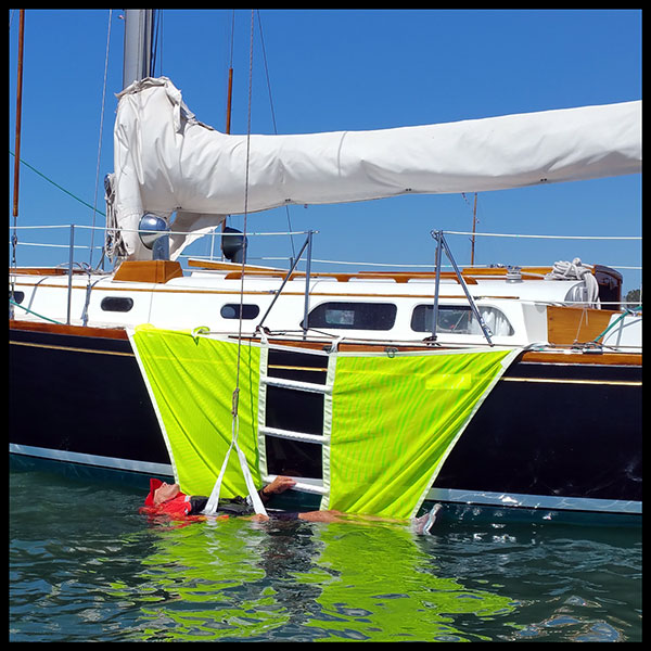 The SOS Recovery Ladder answers the question for all boaters and makes for a good plan to get you back on board. If you either intentionally go for a swim, or fall overboard, most boats do not have a facility to get you back on board.