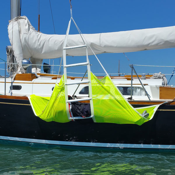 SOFTdesign, unlike typical boarding ladders, this mesh boarding ladder with lightweight rungs wont clobber the victim when the boat rolls.